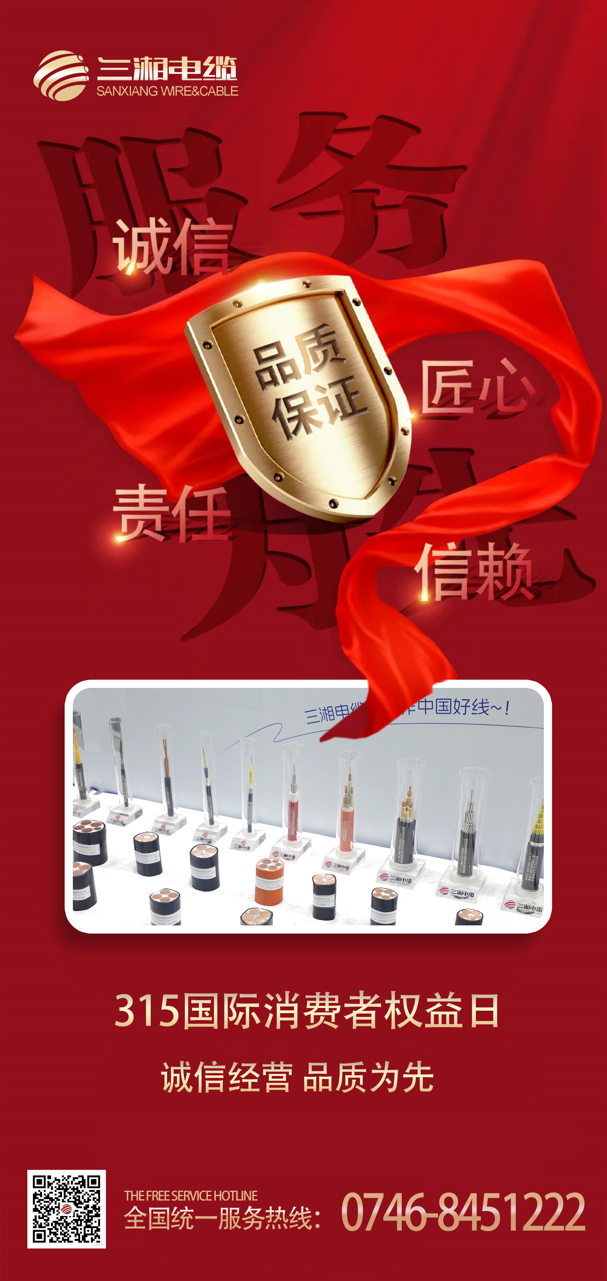 3·15消費者權益日到了,誠信一直是三湘電纜自始至終堅守的使命與責任,作為高品質電線電纜制造商,三湘電纜從1999年創立至今,25年來踐行誠信的態度始終如一,堅持以高質量的產品品質保障消費者對線纜的需求,以“服務 品質 誠信 共贏”的核心發展理念贏得客戶的滿意與認可!